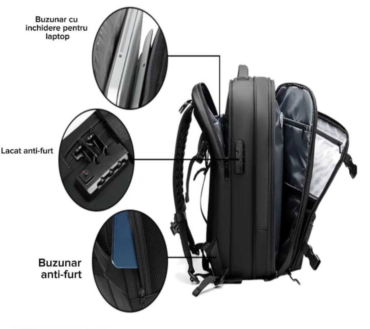 Buzunare multiple, inclusiv compartimente ascunse anti-furt pentru pașaport, bani sau telefon.
